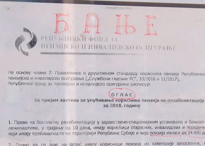 Konkurs za besplatno korišćenje rehabilitacije u banjama Srbije traje do 13. aprila a komisija koja obavlja rangiranje i određuje listu korisnika po završenim prijavama objaviće rezultate na oglasnoj tabli Udruženja penzionera.
